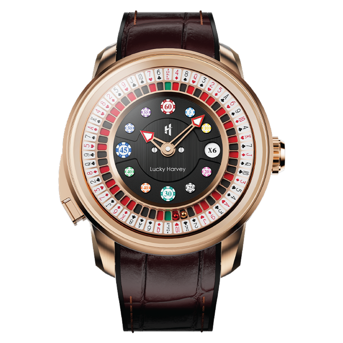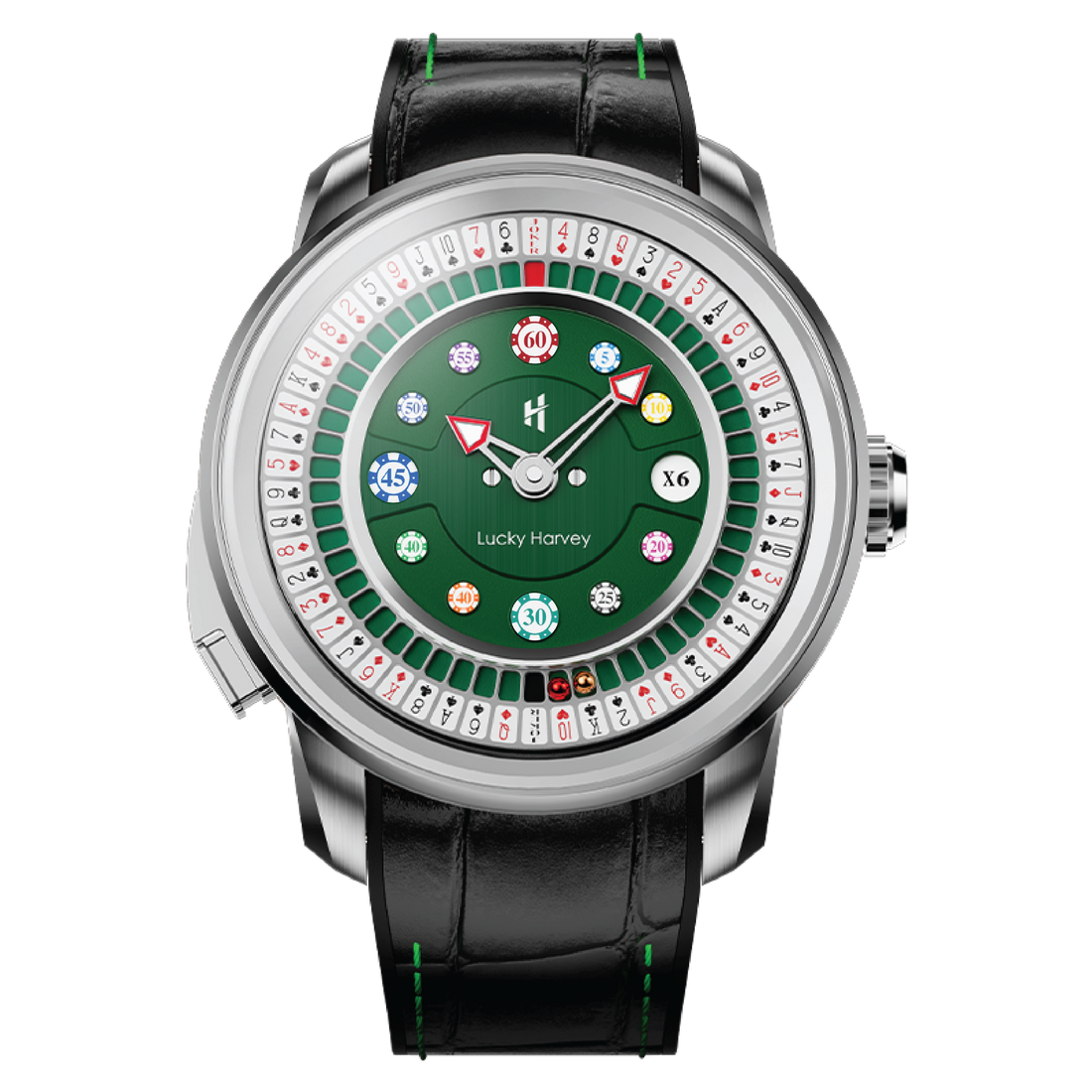 Merging poker and roulette motifs, this timepiece offers a distinctive design for enthusiasts of both games.