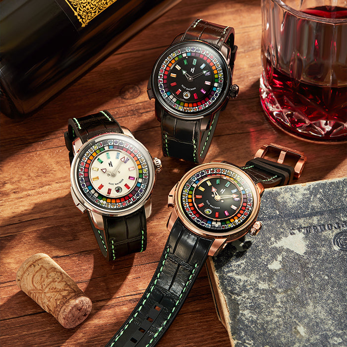 Inspired by classic casino slot machines, the dial transforms timekeeping into an interactive experience. The slot-style display brings movement, intrigue, and personality to the wrist, making this watch a natural conversation starter.